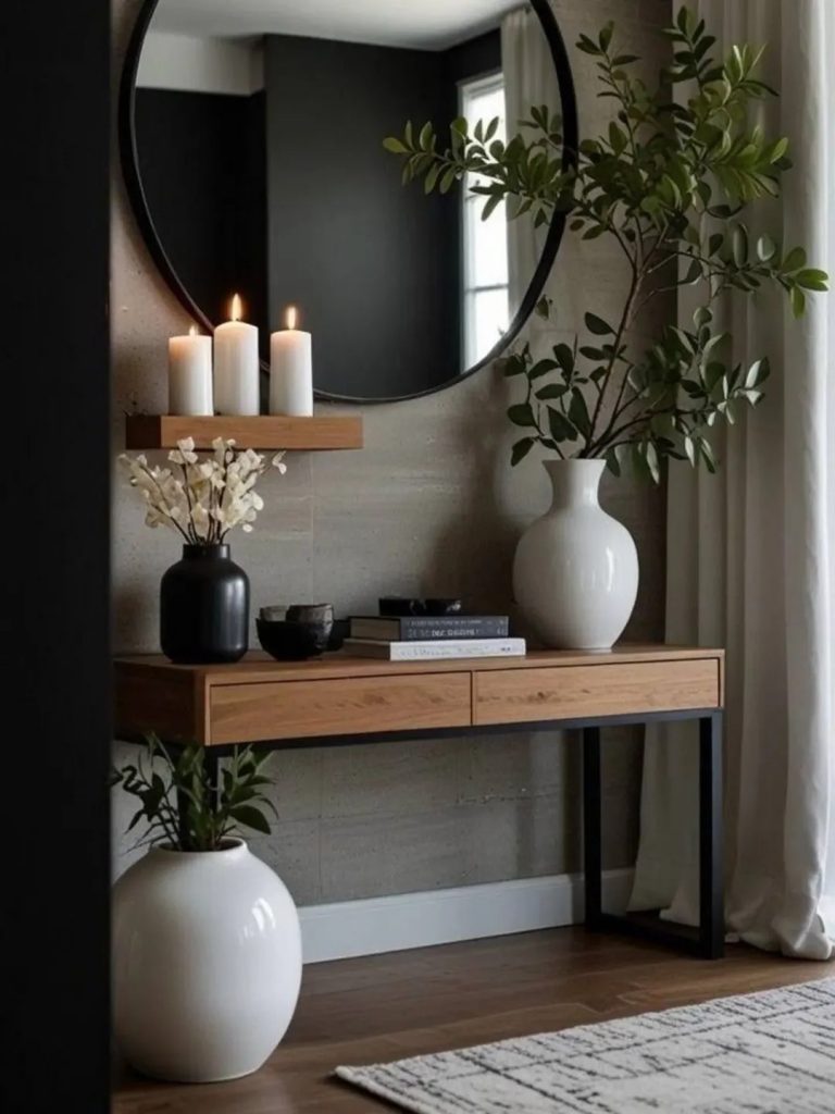 ✔️Середина (основа): крупный «якорь» — высокая ваза или стопка книг.